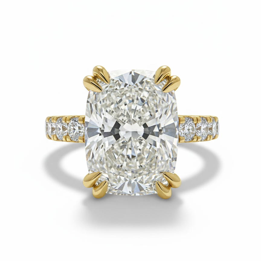 A stunning engagement ring centered around a cushion-cut lab-grown diamond, delicately held by refined split claw prongs that enhance its brilliance and elegant shape. The shank is adorned with shimmering pavé-set diamonds, adding layers of sparkle and a luxurious touch from every angle. Designed to blend timeless romance with modern craftsmanship, this ring features a sustainably grown diamond for beauty you can feel good about.